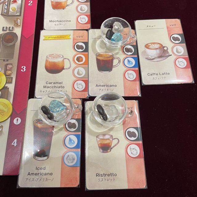 さらに他の人に追加の注文が配られます。手番の最後に時間が経過します。 注文を時間内にこなせなかった場合、満足できなかったお客さんからマイナス評価を付けられます。
