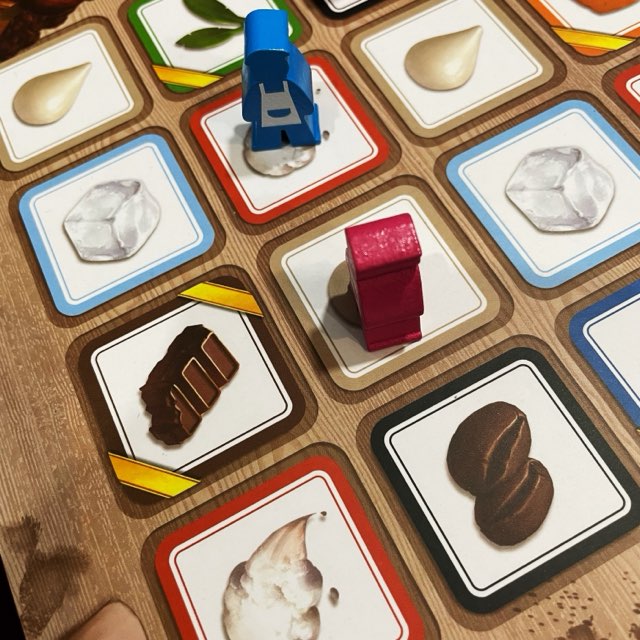自分のバリスタ駒をボード上の縦横に3歩まで動かし、通ったマスに描かれた材料を入手します。 手に入れた材料を注文カードにぴったり合うようにカップに入れたら完成!満足したお客さんからプラス評価をもらえます。